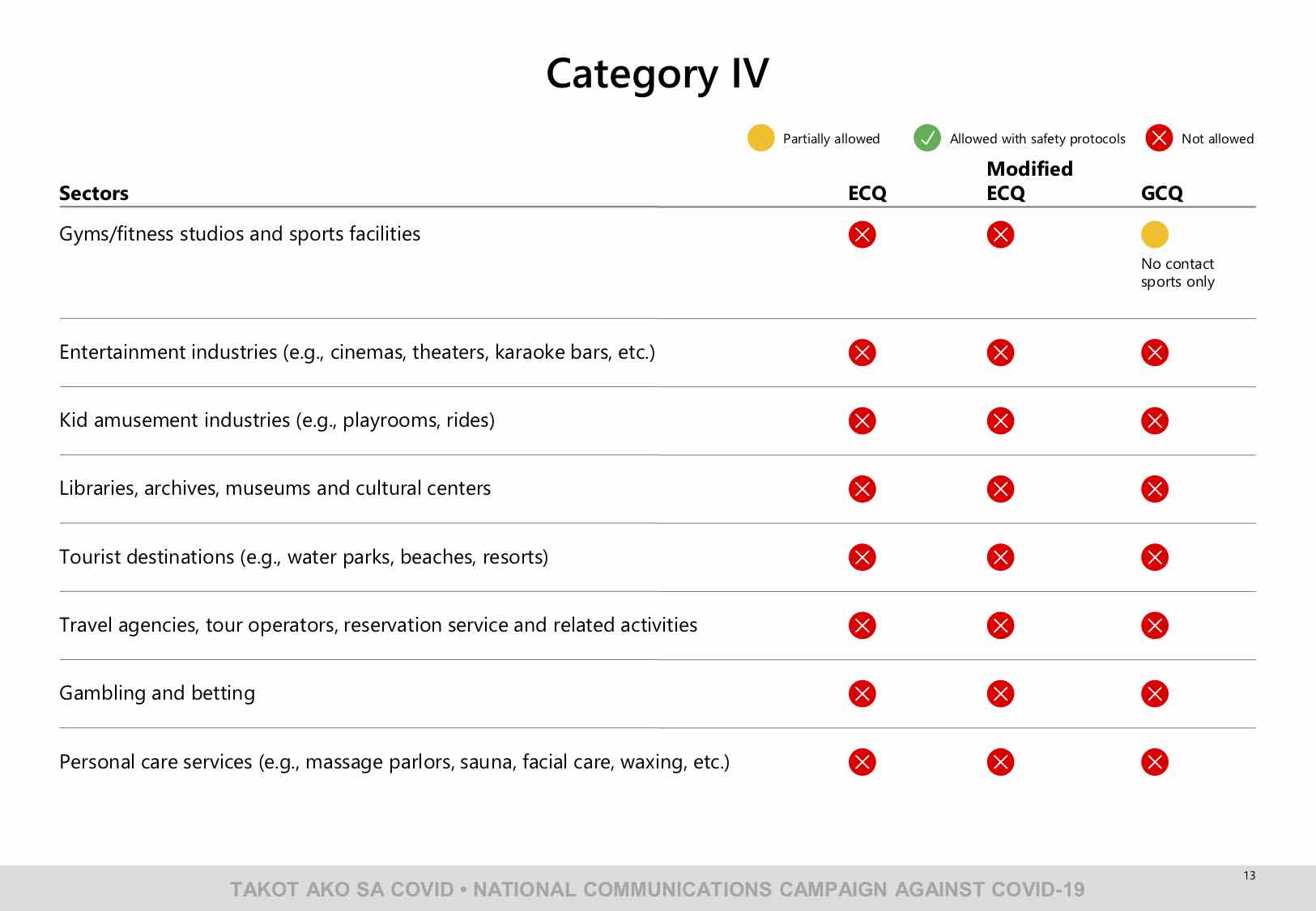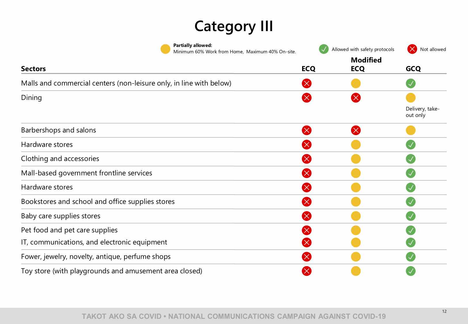 The following are the industries allowed to operate under ECQ, MECQ, or GCQ as released by the National Communications Campaign against COVID-19: