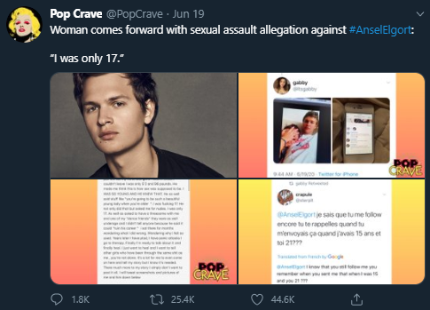 Ansel Elgort, Justin Bieber, and Cole Sprouse were being called out on Twitter this past week by numerous accounts for allegedly committing sexual assault—a wide range of unwanted sexual behaviors that occur without the explicit consent of the victim—as victims fired shots and spoke up with their stories.