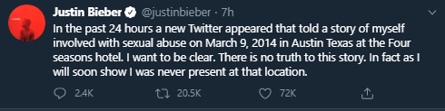 "I don’t normally address things as I have dealt with random accusations my entire career but after talking with my wife and team I have decided to speak up on an issue tonight," Bieber wrote on his own Twitter account on Sunday night.