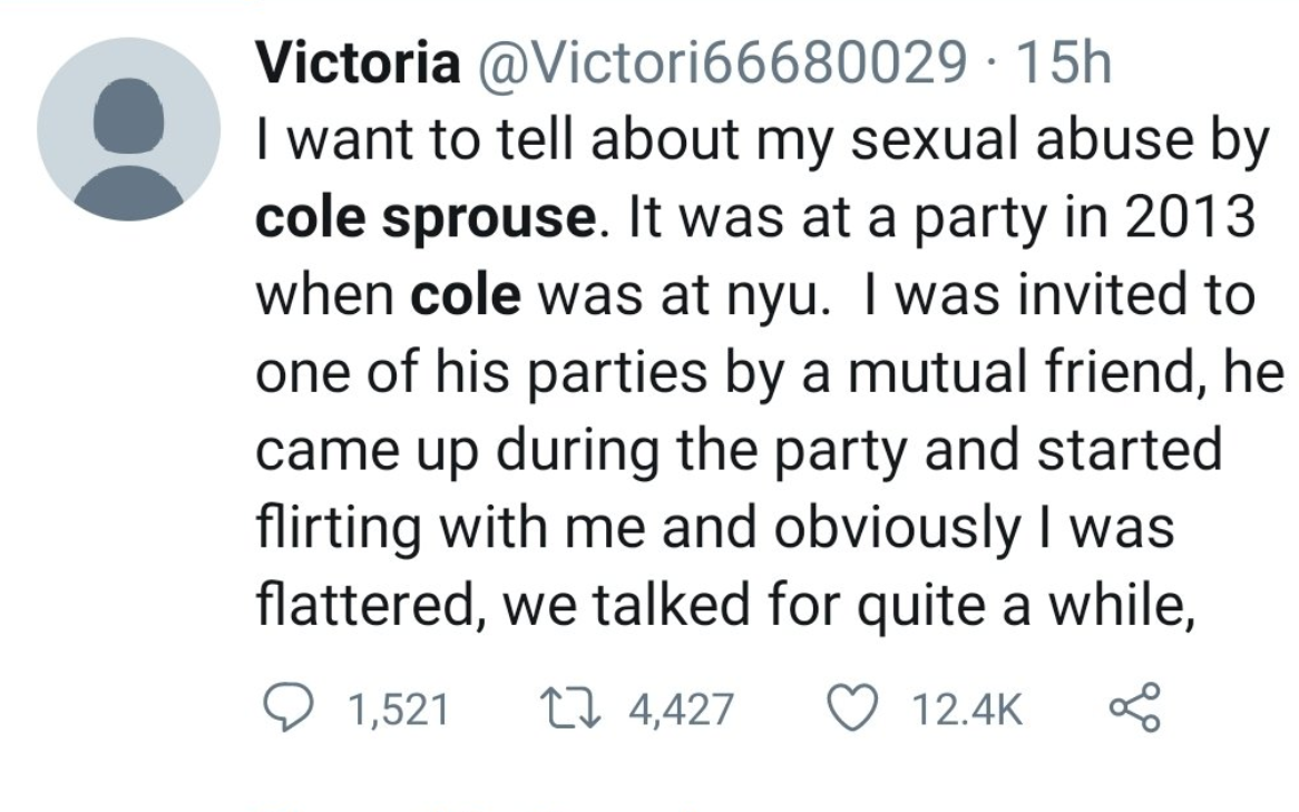 “I want to tell [you] about my sexual abuse by Cole Sprouse. It was at a party in 2013 when Cole was at NYU. I was invited to one of his parties by a mutual friend, he came up during the party and started flirting with me and obviously I was flattered, we talked for quite a while,” Victoria wrote.