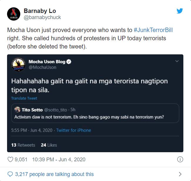 On Thursday, June 4, 2020, amidst the resistance and outrage to the anti-terror bill which feared majority that it might be solely used by the government against its critics and opposition. Mocha Uson, Deputy Administrator of the Overseas Workers Welfare Administration (OWWA), has struck once again by tagging the #JunkTerrorBillNow protesters as ‘terrorists’ – the thing that Filipinos are most worried about the bill.