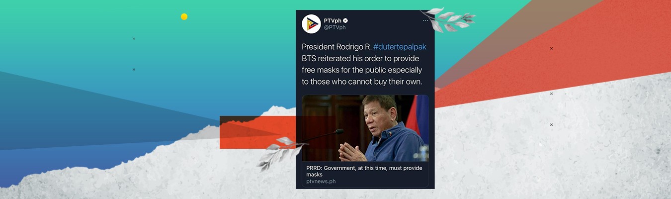 “At around 7:00 p.m., a post of PTV on Twitter circulated with the wrong hashtag which was never in the original caption which reads: ‘President Rodrigo R. Duterte reiterated his order to provide free face masks for the public especially to those who cannot buy their own’,” the PTV said in its statement.