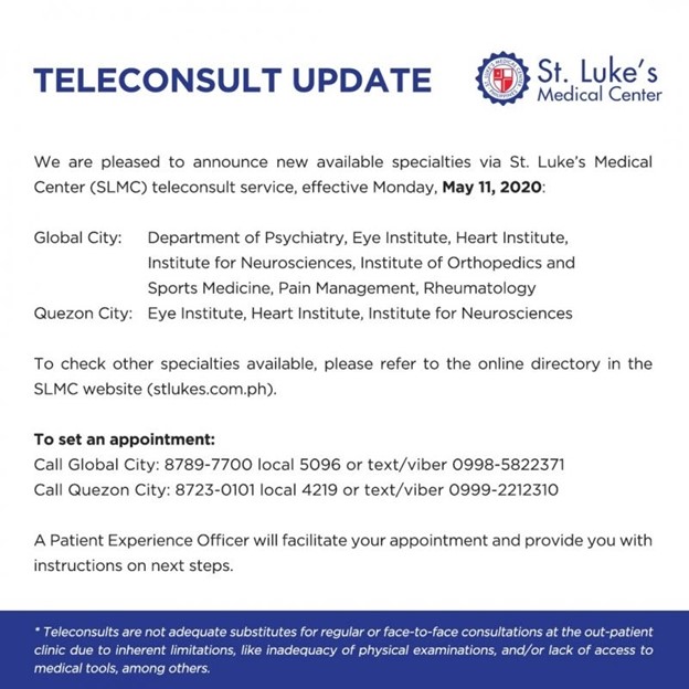 For more information, refer to St. Luke’s Medical Center’s official Facebook page: https://www.facebook.com/StLukesPH/