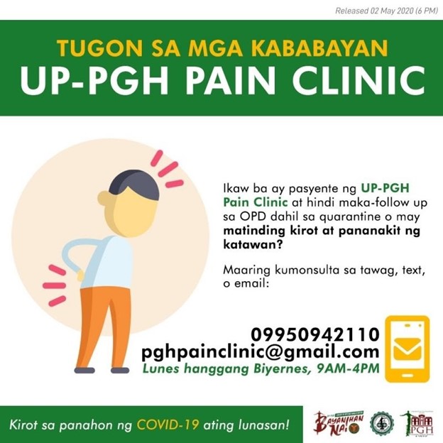 University of the Philippines-Philippine General Hospital Pain Clinic also added Telemedicine in their service. It is open for patients who have COVID or non-COVID medical concerns. For booking of appointments, you may send them a message via SMS or email. The aforementioned clinic is available from Monday to Saturday, from 9 am-4 pm.