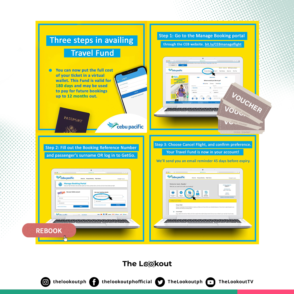 Cebu Pacific offered options such as flight rebooking, storing of your ticket value as Travel Fund that is valid for 180 days and can be used within the next 12 months to book any Cebu Pacific flight or get your full refund. To process any of this, visit this link