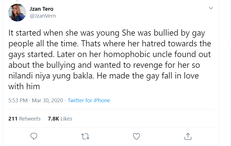 Sam Morales defended herself (which was part of Jzan’s tweet) saying she had a past trauma involving gays when she was young. She said that she was bullied by gay people all the time.