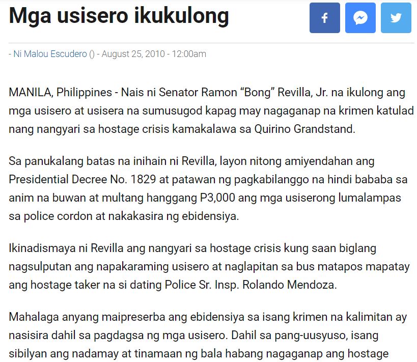 Sa buong bansa naman, taong 2010 nang ihain ni Senador Bong Revilla ang Senate Bill 2399 o ang Anti-Usisero Bill para sa mga taong basta na lamang papasok sa mga cordon o pinangyarihan ng krimen ay maaaring makulong hanggang anim na buwan or magbabayad ng tatlong libong piso.