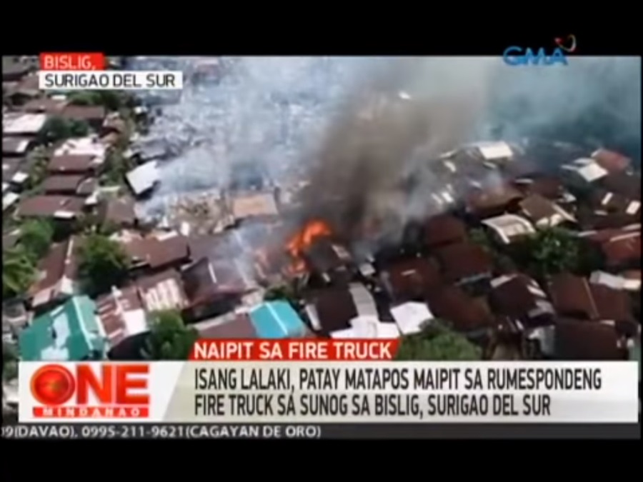 Isang balita tungkol sa isang lalaki na sinasabing nanood daw sa pagresponde ng mga awtoridad sa isang malaking sunog ang naipit ng fire truck sa Bislig, Surigao Del Norte.